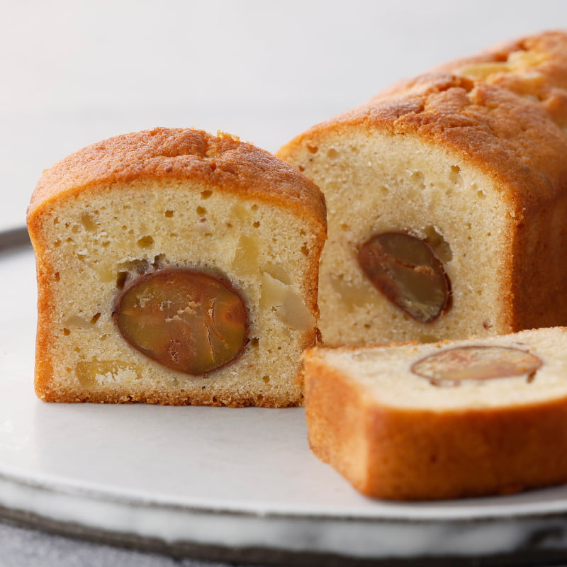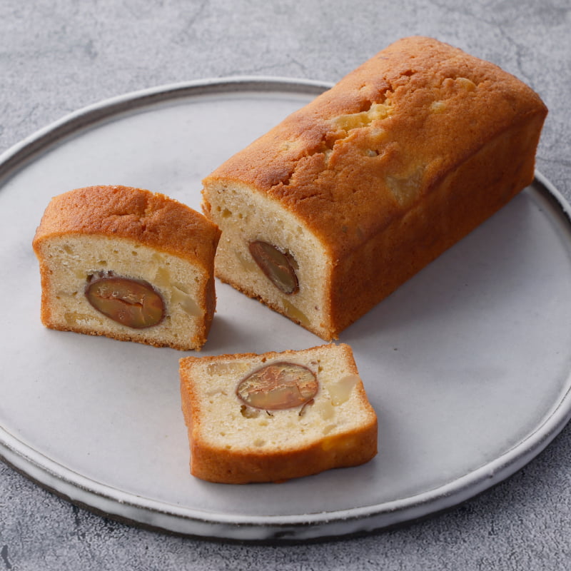 刻んだ国産栗の甘露煮と和栗ペーストを、生地全体にしっかりと練り込んだパウンドケーキ。さらに、パウンドの中央には国産栗の渋皮煮を丸ごと敷き詰め、仕上げにラム酒入りシロップを染み込ませた贅沢な味わいです。