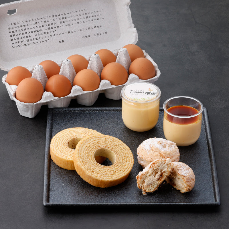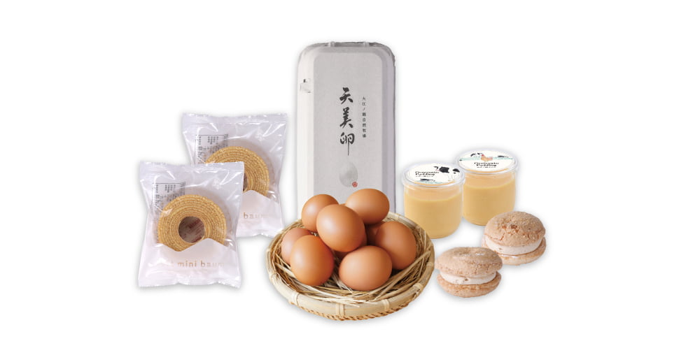 内容量 | 天美卵MSサイズ10個 プラリネダックワーズ(直径約5.5cm)2個 大江ノ郷ぷりん(約90g)2個 やわらかミニバウム(直径約8cm、高さ約2cm)2個 |