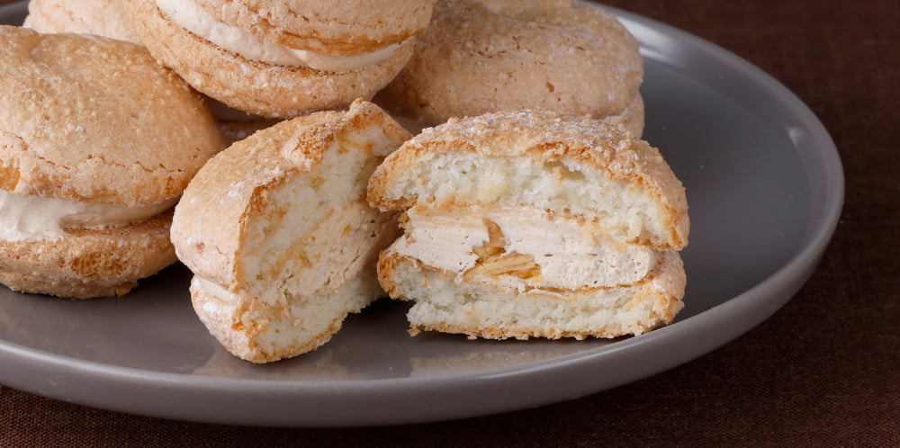 天美卵の卵白にアーモンド粉を合わせ、外はさっくり、中はふんわりと焼き上げました。香ばしいアーモンドプラリネ入りのなめらかなバタークリームと、カリッとしたキャラメリゼアーモンドをサンド。豊かな香りと軽やかな食感が楽しめる、季節限定のひと品です。