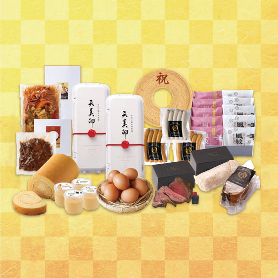 天美卵MSサイズ10個(水引パック)2パック 大江ノ郷ぷりん(約90g)4個入1箱 焼印入バウムクーヘン(祝)(直径約14cm×高さ約4cm)1個 大江ノ郷バターロールケーキ(長さ約16cm)1個 風紋まんじゅう・彩り二種~芋あん・粒あん~(風紋まんじゅう5個、風紋まんじゅう芋あん5個)(各約6cm角)1箱 鳥取和牛ローストビーフブロック赤身タイプ(約200g)1パック 特製ポン酢1本 大江ノ郷ロースハムブロック(約400g)1パック 粗挽きソーセージ(約135g・5本入り)1パック ハーブソーセージ(約135g・5本入り)1パック ニュールンベルガー(約135g・5本入り)1パック 鳥取和牛しぐれ(約90g)1袋 郷のパエリアの素(約340g・2合用)1パック 鹿野地鶏の鶏ハムプレーン(約180g)1パック |