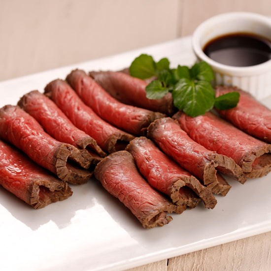 | 鳥取和牛ローストビーフ赤身タイプ | 【鳥取和牛ローストビーフ】牛肉(鳥取和牛)(鳥取県産)、にんにく、食塩、胡椒、(一部に牛肉を含む)【特製ポン酢】濃口醤油(本醸造)(国内製造)、本みりん、柑橘果汁(かぼす、すだち)、花かつお、真昆布、(一部に小麦・大豆を含む) |