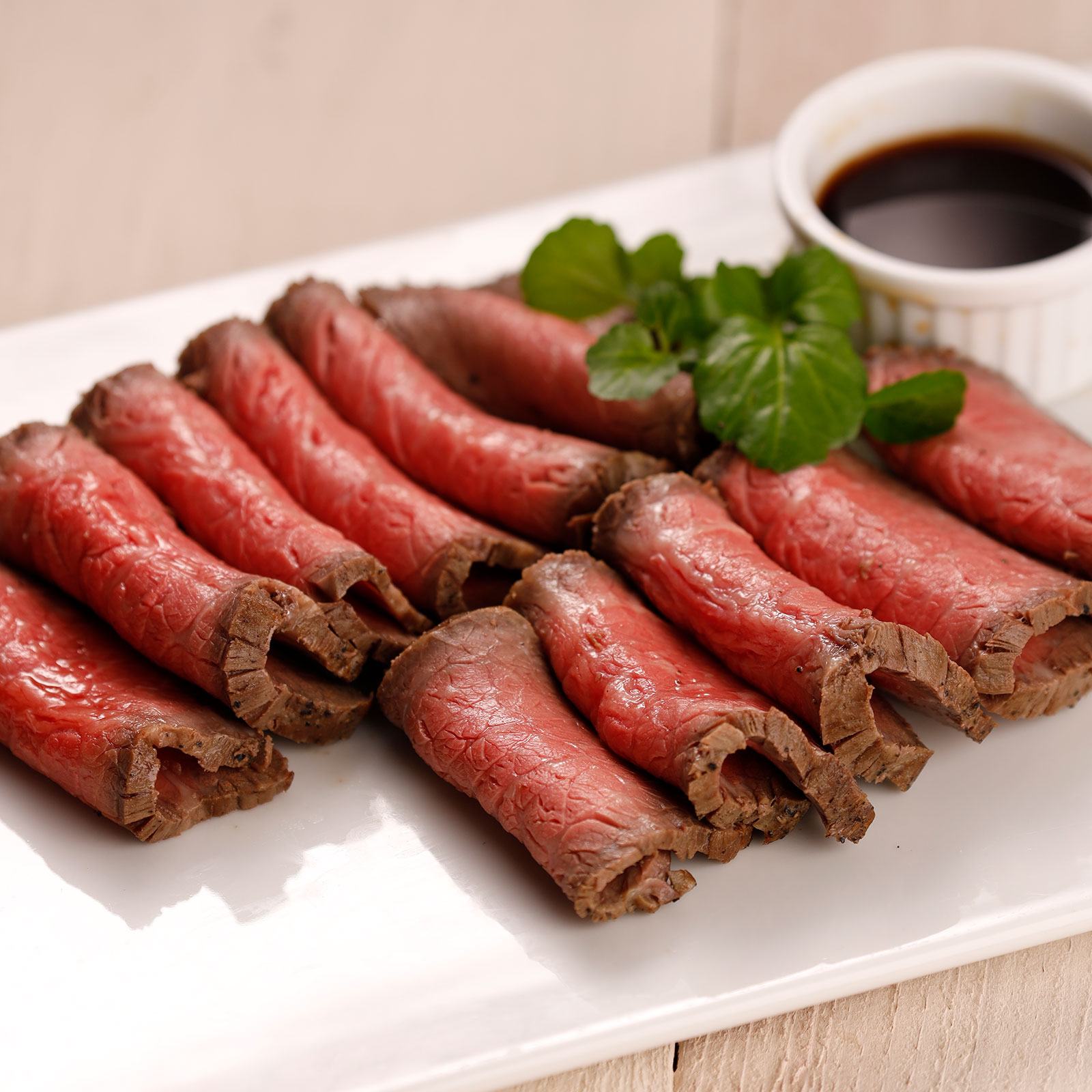 肉質日本一を誇る鳥取和牛を低温調理で仕上げたローストビーフ。しっとりと柔らかく、噛むほどに肉と脂の旨みが広がります。柑橘の酸味をキリっと効かせた自家製のポン酢と一緒にお召し上がりください。
