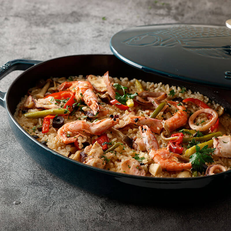 国産赤エビをはじめ、タコやイカなどの魚介の旨みがあふれる、本格パエリアの素。 洗ったお米に、パエリアの素を加えて、炊き上げるだけ!簡単におうちでプロの味が完成します。