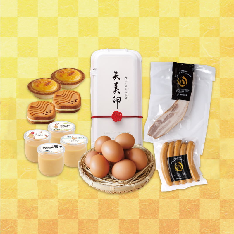 天美卵MSサイズ10個(水引パック) 大江ノ郷ぷりん(約90g)4個 風紋まんじゅう(約6cm角)2個 大江ノ郷タルト(直径約7cm)2個 粗挽きソーセージ(約135g・5本入り)1パック 大江ノ郷ベーコン(約100g)1パック |