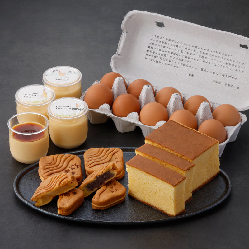 内容量 | 天美卵MSサイズ10個 風紋まんじゅう(約6cm角)2個 風紋まんじゅう芋あん(約6cm角)2個 大江ノ郷熟成かすてら(長さ約12cm)1本 大江ノ郷ぷりん(約90g)4個 |