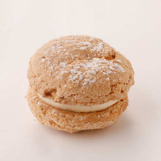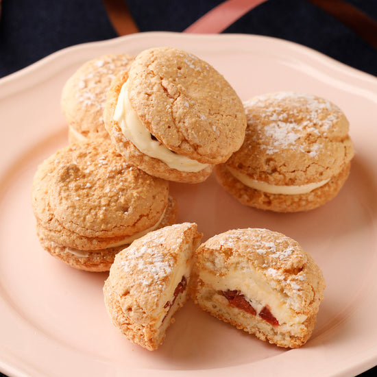 苺の香りがふわ~っと広がり、口どけの良いなめらかなバタークリームとともに、やわらかにほどける焼き菓子、苺のダックワーズ。
